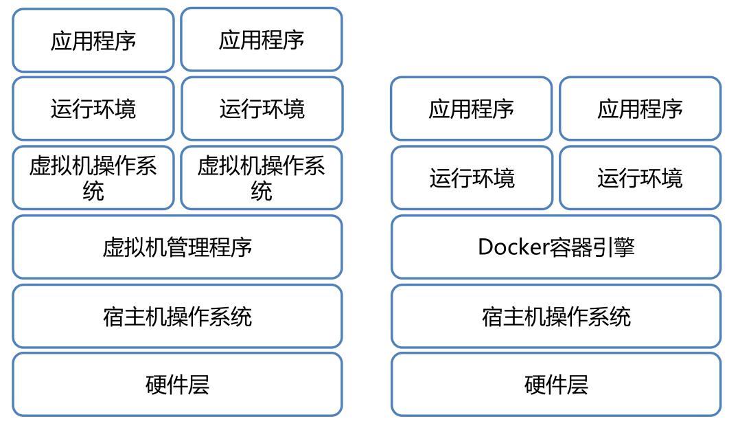 传统方式是在硬件层面实现虚拟化,需要有额外的虚拟机管理应用和虚拟机操作系统层。Docker容器时在操作系统层面实现虚拟化,直接复用本地主机的操作系统,因此更加轻量级。