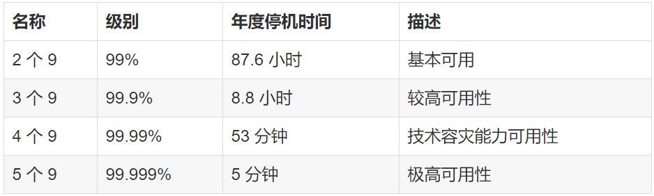 如果一个服务承诺99.99%的SLA(即4个9),意味着全年服务不可用的时间小于等于 53 分钟(从3个9提升到4个9是一个非常有挑战的过程)