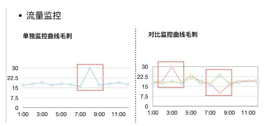 从图中左侧部分可以看到,8 点钟有流量的突增,这时候我们需要确认为什么会有流量的突增。是业务的正常表现,还是有其他的异常流量进入。 从图中右侧部分可以看到,每条曲线代表了每一天的流量统计,红色曲线相对于其他几天的流量曲线在凌晨 3:00 和早上 8:00 的时候有明显的流量毛刺, 这时候我们就需要确认是什么因素造成流量数据的突变。 通过对于流量毛刺的观察,能够让我们及时了解业务中的风险,及时做好预警与准备。